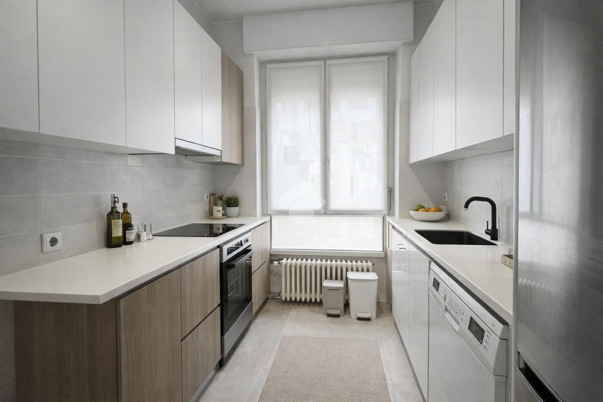 L’appartamento si compone di ingresso, luminoso soggiorno, cucina e tinello, doppi servizi entrambi finestrati, uno completo di doccia e l’altro di doccia multifunzione.